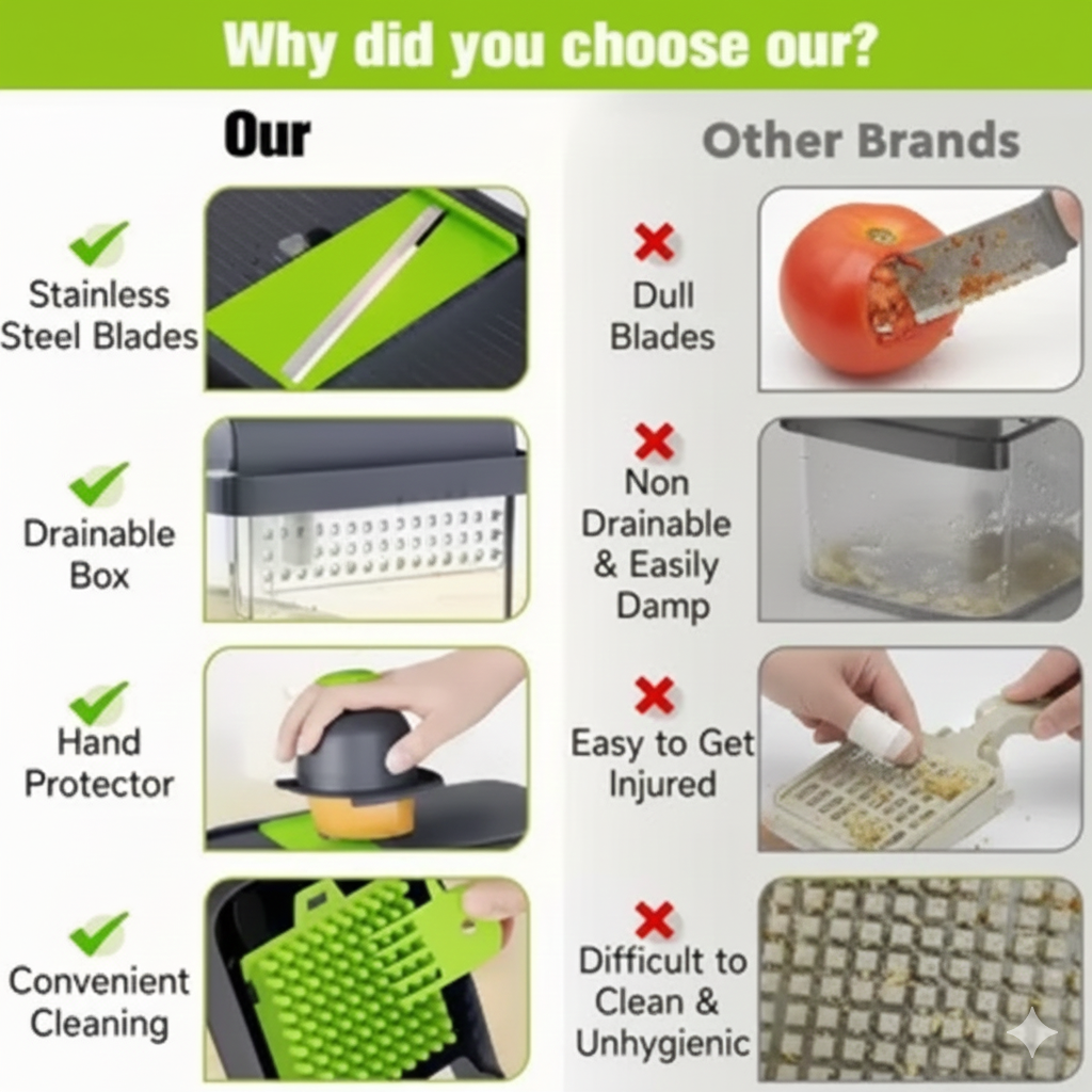 No more juggling knives, cutting boards, and bowls. The Meal-Prep Master Cutter keeps everything in one container — chopping, slicing, grating, and storing — making meal prep quick, clean, and stress-free.